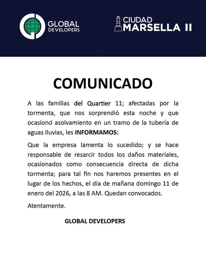 Por su parte, la empresa involucrada emitió un comunicado en el que aseguró que responderá por las pérdidas de las familias afectadas. En el documento, la compañía Global Developers informó que brindará todo el apoyo necesario a las personas damnificadas por las inundaciones registradas la noche del incidente en el Complejo Habitacional “Marsella II”.