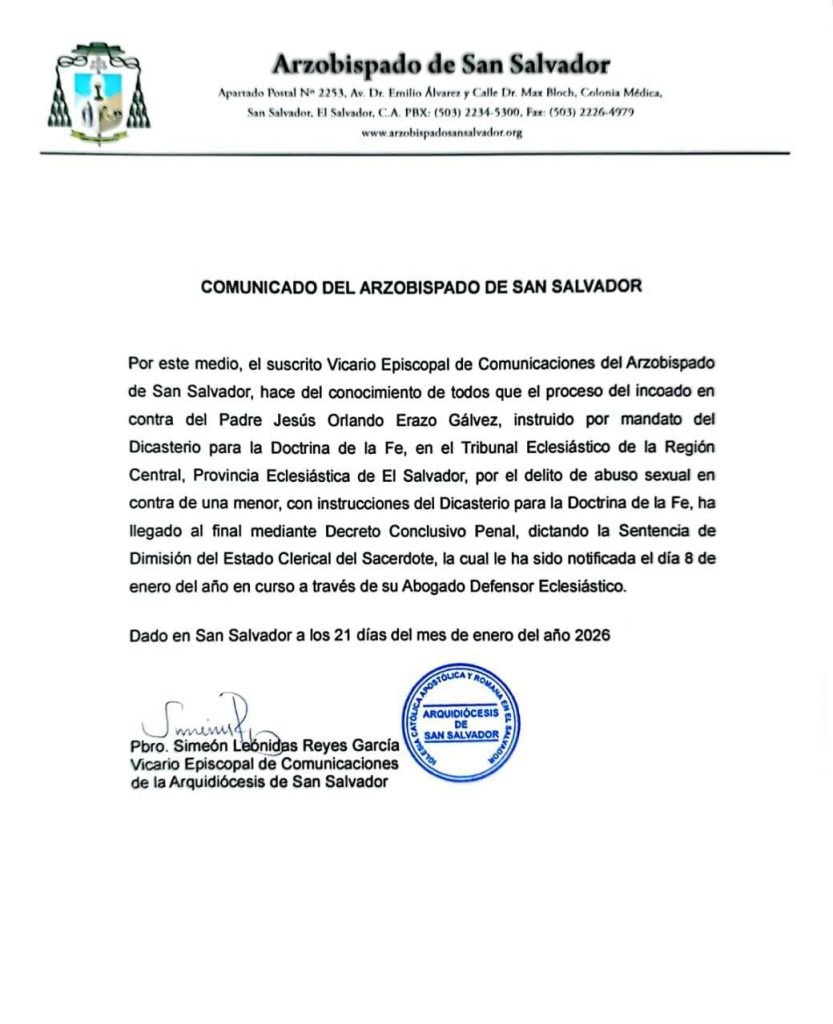 El comunicado fue emitido el 21 de enero de 2026 y está firmado por el presbítero Simeón Leónidas Reyes García, Vicario Episcopal de Comunicaciones de la Arquidiócesis de San Salvador.