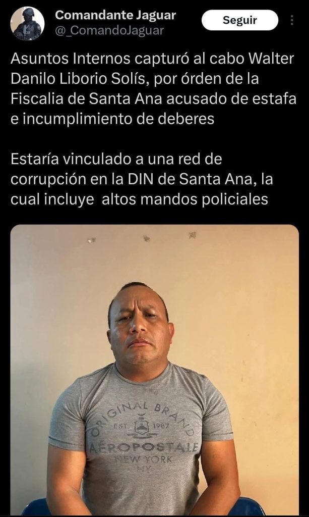 De acuerdo con publicaciones que circulan en la red social X, atribuidas a la cuenta denominada Comandante Jaguar, el procedimiento habría sido ejecutado por la unidad de Asuntos Internos de la PNC. En dichas publicaciones se señala que el cabo estaría presuntamente vinculado a una red de corrupción que operaría dentro de la División de Investigaciones (DIN) en Santa Ana, en la que también figurarían otros mandos policiales.