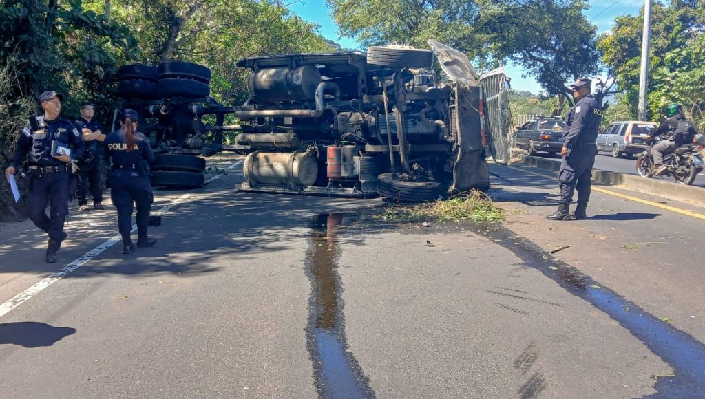 La Libertad, El Salvador.— El paso vehicular se mantiene restringido en el kilómetro 32 de la carretera que de Sonsonate conduce a San Salvador, en el distrito de Colón, luego de que el conductor de una rastra perdiera el control de la unidad.