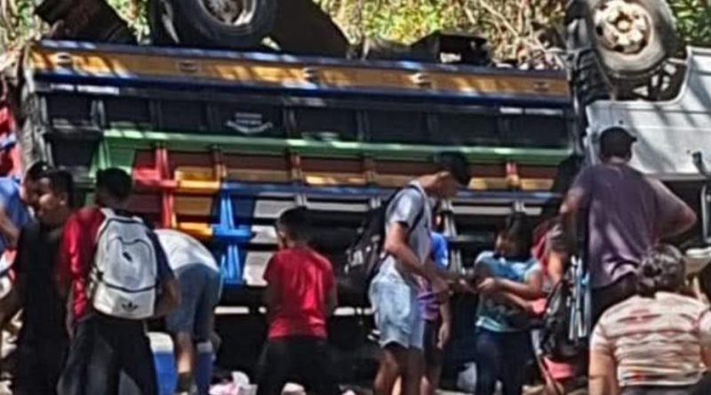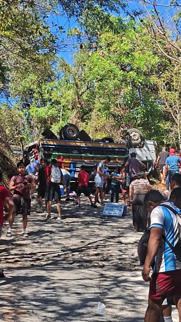 Morazán, El Salvador.— Un camión que transportaba jugadores y aficionados sufrió un percance vial este domingo y volcó en el cantón Pueblo Viejo, distrito de Yoloaiquín, en la zona sur del departamento de Morazán, informaron fuentes locales.
