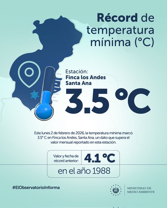 De forma paralela, el Ministerio de Medio Ambiente reportó un nuevo récord de temperatura mínima en la Finca Los Andes, en Santa Ana, donde se registraron 3.5 grados Celsius, superando el récord anterior de 4.1 grados establecido en 1988.