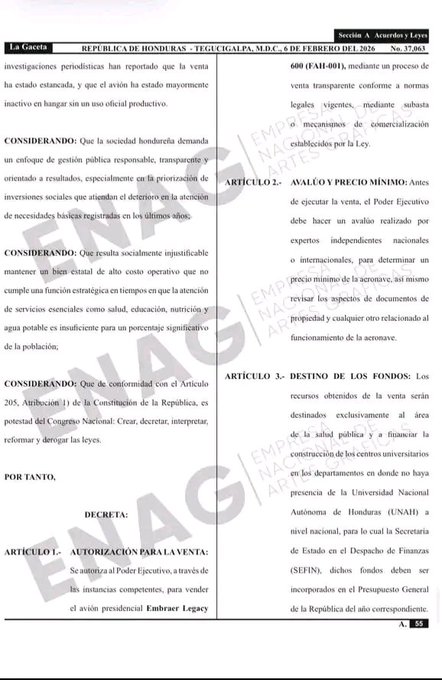El Gobierno de Honduras recibió autorización oficial para proceder con la venta del avión presidencial Embraer Legacy 600, según lo publicado en el Diario Oficial La Gaceta.