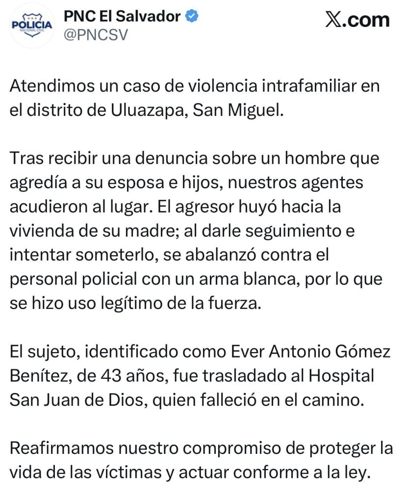 A través de sus redes sociales, la PNC señaló que el procedimiento se enmarca en un acto de uso legítimo de la fuerza. El caso continúa bajo las diligencias correspondientes para esclarecer los hechos.