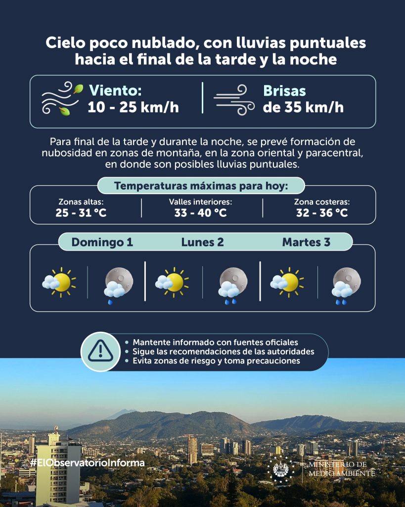 San Salvador, 1 de marzo de 2026. — El Ministerio de Medio Ambiente y Recursos Naturales (MARN) informó que este domingo se prevé un ambiente caluroso en la mayor parte del territorio nacional, con cielo poco nublado y probabilidad de lluvias en sectores de la zona oriental y paracentral del país.