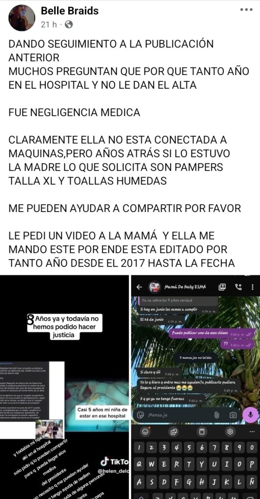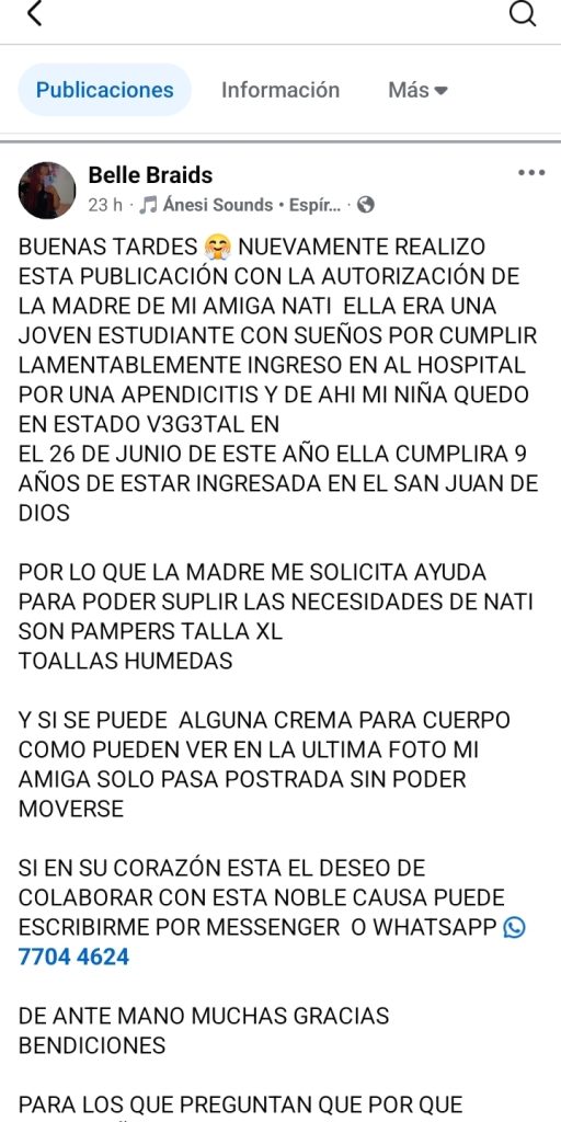 Santa Ana. — Familiares y personas cercanas solicitan apoyo solidario para Nathalia Ivone Peña, una joven que permanece ingresada desde 2017 en el Hospital San Juan de Dios, tras complicaciones derivadas de una cirugía por apendicitis.