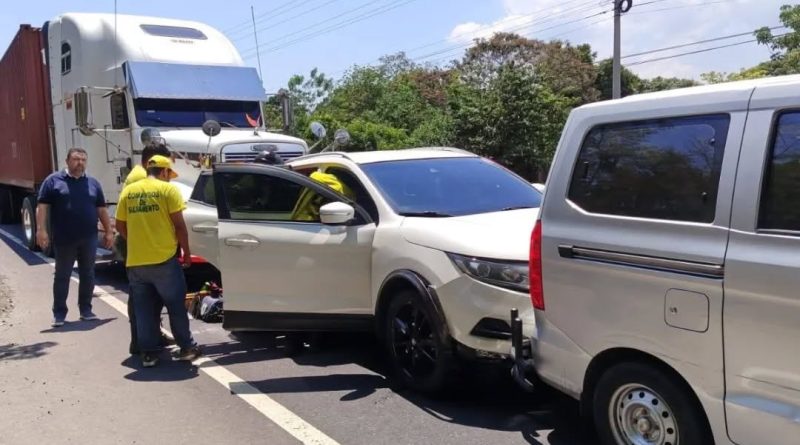 Izalco. — Un hombre de 41 años, identificado con el apellido Rodríguez, resultó lesionado tras una colisión múltiple registrada sobre la carretera que conduce de San Salvador hacia Sonsonate, a la altura del desvío de Piedras Pachas.