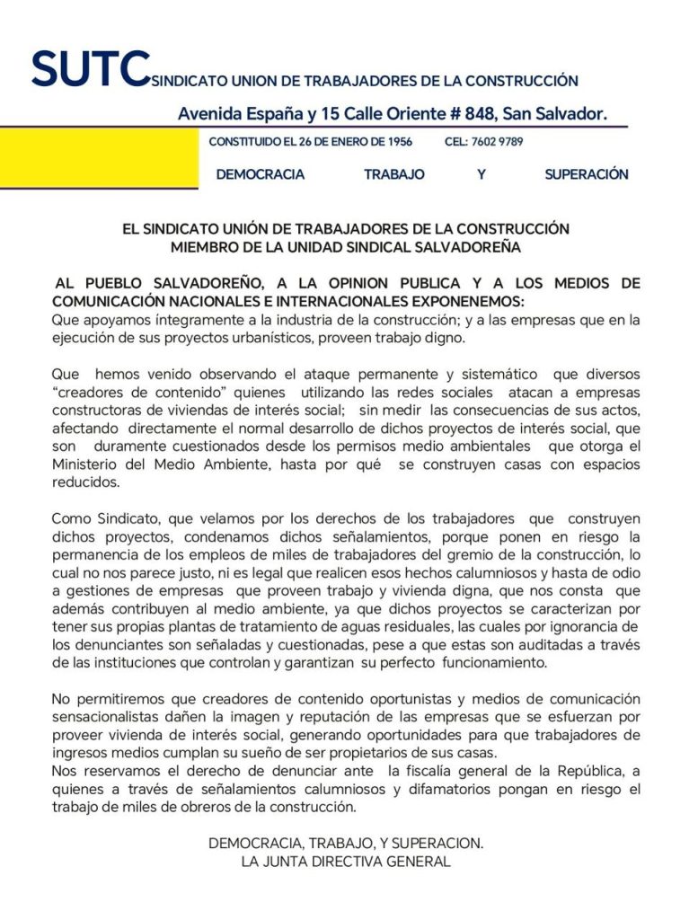 El Sindicato Unión de Trabajadores de la Construcción de El Salvador (SUTC) se pronunció públicamente en respaldo a la industria de la construcción y a las empresas que desarrollan proyectos de vivienda en el país.