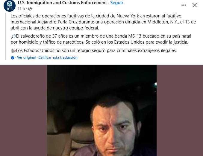 El Servicio de Inmigración y Control de Aduanas (ICE) informó sobre la captura del salvadoreño Alejandro Perla Cruz, de 37 años, durante un operativo realizado el pasado 13 de abril en Middleton, en el estado de Nueva York.