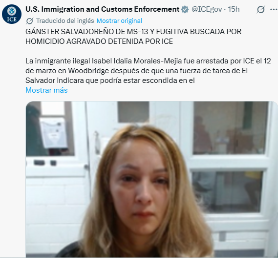 El Servicio de Inmigración y Control de Aduanas (ICE) informó sobre la detención de la salvadoreña Isabel Idalia Morales-Mejía, quien era requerida por la justicia de El Salvador por delitos graves.