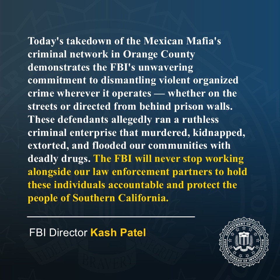 El Buró Federal de Investigaciones (FBI) informó sobre la detención de 30 personas señaladas como presuntos integrantes de la organización conocida como Mafia Mexicana, tras un operativo desarrollado en el sur de California.