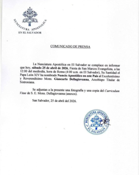 El anuncio fue realizado al mediodía, hora de Roma, mediante un comunicado oficial difundido en El Salvador.