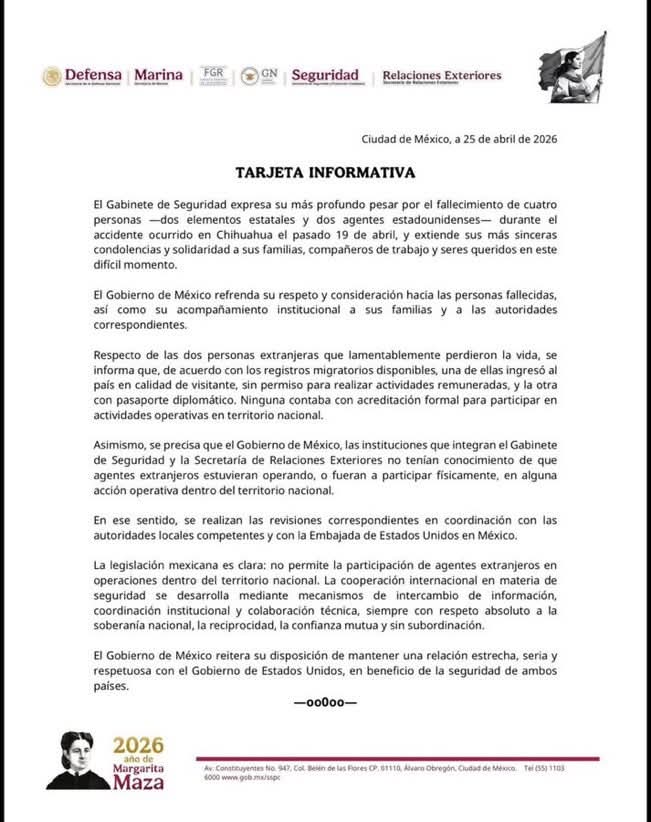 Por su parte, el Gobierno federal mantiene comunicación con la Embajada de Estados Unidos en México para esclarecer los hechos y garantizar que las acciones conjuntas en materia de seguridad se apeguen al marco legal vigente.