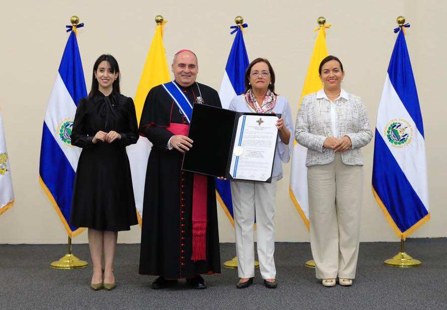 La canciller de la República, Alexandra Hill Tinoco, informó sobre la condecoración otorgada al nuncio apostólico, monseñor Luigi Roberto Cona, con la Orden Nacional José Matías Delgado en el grado de Gran Cruz Placa de Plata.