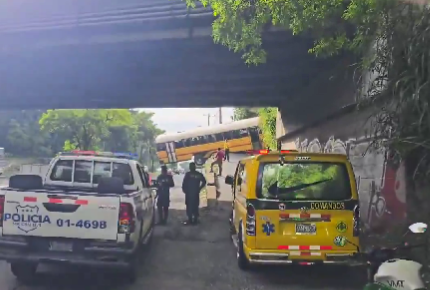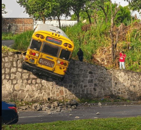 San Salvador, El Salvador. — Un bus de color amarillo protagonizó un percance vial en el puente que conecta la colonia San José con la Carretera de Oro, en el municipio de Soyapango, la mañana de este viernes.