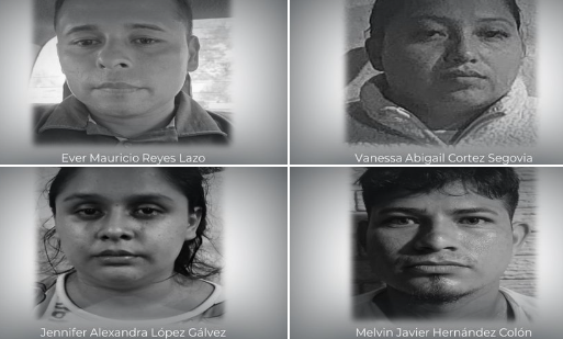 Los capturados fueron identificados como Ever Mauricio Reyes Lazo, Vanessa Abigail Cortez Segovia, Jennifer Alexander López Gálvez y Melvin Javier Hernández Colón.