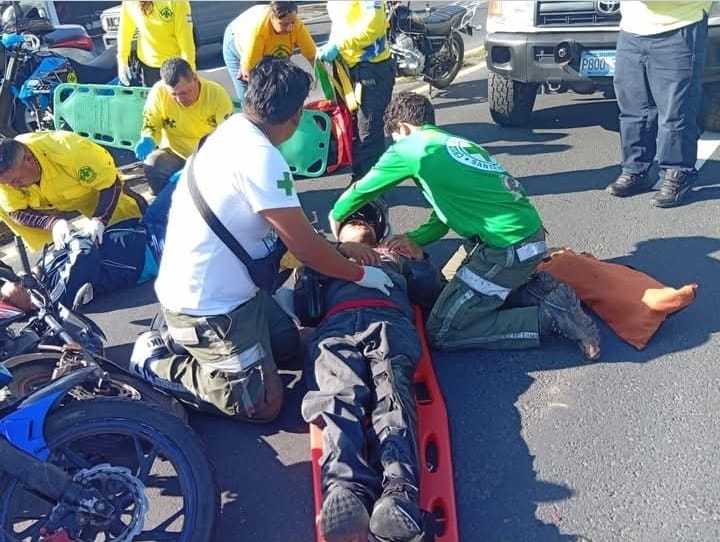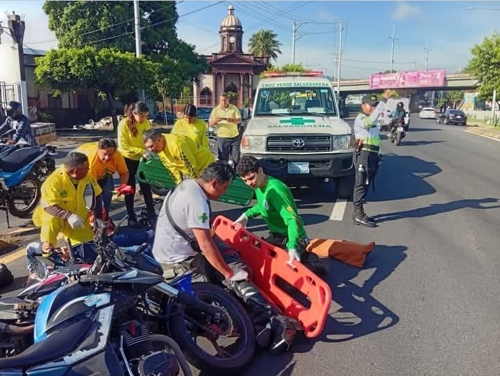 De acuerdo con el reporte de los socorristas de Cruz Verde Salvadoreña, seccional Santa Anita, los motociclistas fueron colisionados en la parte trasera por una camioneta, lo que provocó que ambos cayeran sobre la vía.