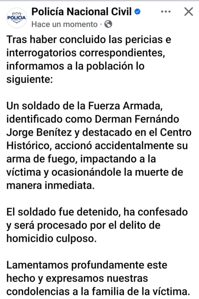 Por su parte, la PNC informó que el responsable fue identificado como Derman Fernando Jorge Benítez, soldado destacado en el Centro Histórico, quien accionó accidentalmente su arma de fuego, impactando a la víctima y causándole la muerte inmediata.