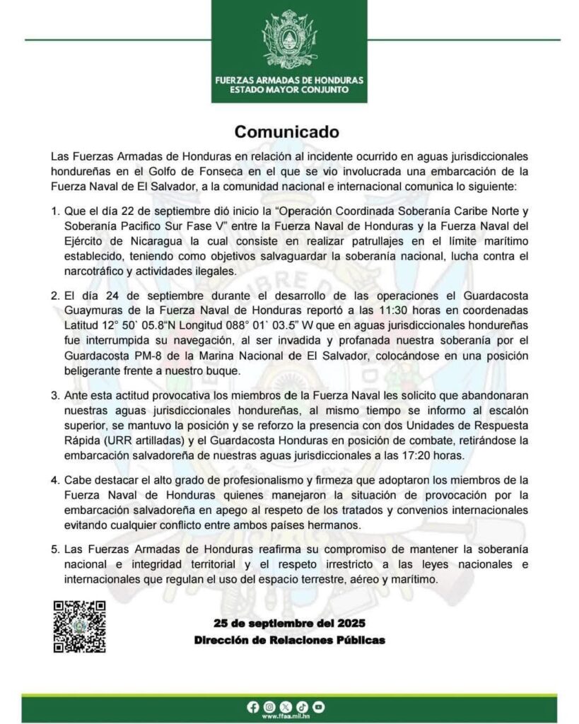 Las Fuerzas Armadas de Honduras informaron mediante un comunicado dirigido a la comunidad nacional e internacional que una embarcación de la Marina Nacional de El Salvador ingresó a aguas jurisdiccionales hondureñas en el Golfo de Fonseca.