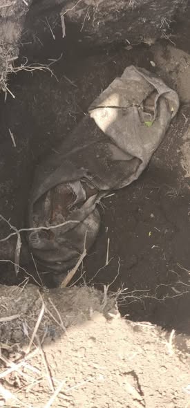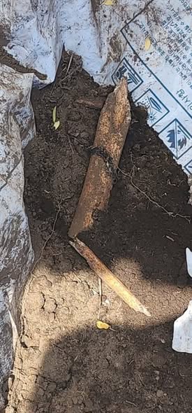 Según el reporte preliminar, entre la tierra se observó un hueso que aparenta ser un fémur, acompañado de un pantalón blanco y otros fragmentos óseos, claramente identificables como restos humanos.