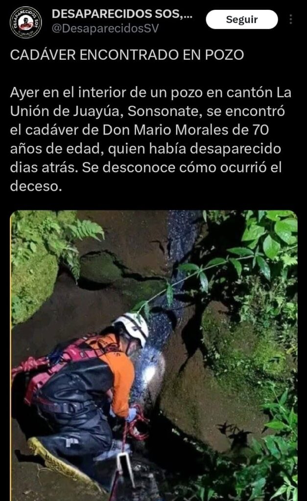 Juayúa, Sonsonate – Cuerpos de socorro realizaron este domingo la recuperación del cadáver de un hombre localizado en el interior de un pozo en el cantón La Unión, en Juayúa, departamento de Sonsonate.