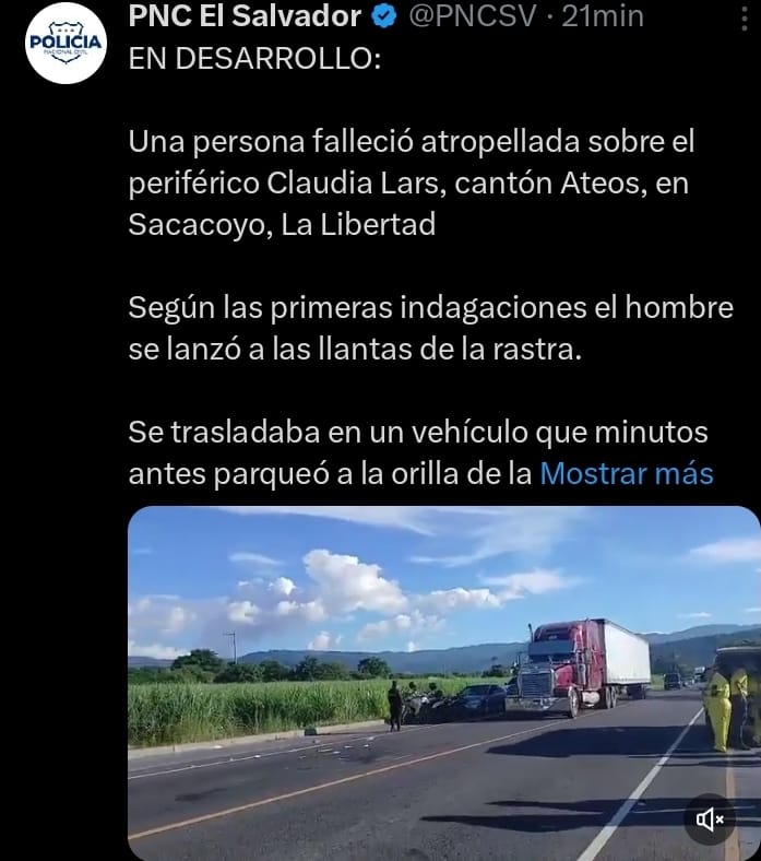 La Libertad. — Un trágico accidente se registró esta mañana en el kilómetro 35½ del periférico Claudia Lars, en el municipio de Opico, departamento de La Libertad, donde un hombre perdió la vida luego de quedar atrapado bajo las llantas de una rastra.