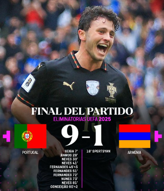 El conjunto dirigido por Roberto Martínez mostró un dominio absoluto de principio a fin y contó con un desempeño ofensivo sobresaliente. Bruno Fernandes y Joao Neves firmaron sendos tripletes, mientras que Renato Veiga, Gonçalo Ramos y Francisco Conceição completaron la abultada cuenta. Armenia había igualado parcialmente por medio de Eduard Spertsyan, pero no logró sostener el ritmo de juego impuesto por los lusos.