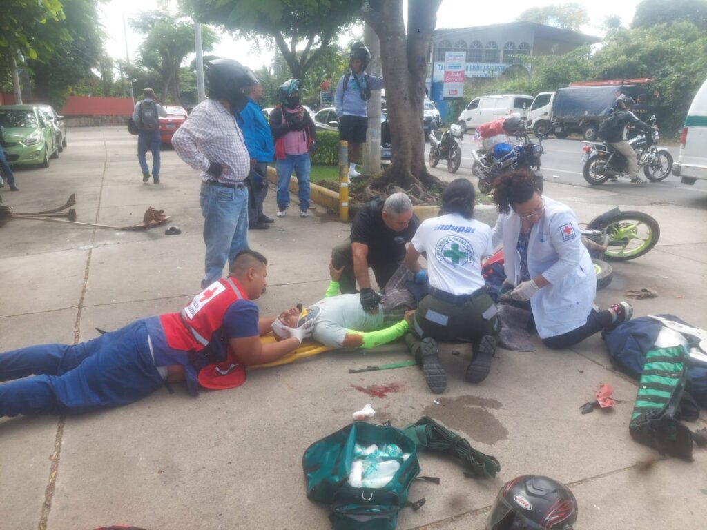 El motociclista, un hombre de 42 años, fue diagnosticado con trauma craneoencefálico, fractura de rótula y fracturas de tibia y peroné en su pierna derecha. Fue atendido en el lugar y trasladado en máxima urgencia al Hospital San Juan de Dios por socorristas de Cruz Verde Santa Ana.